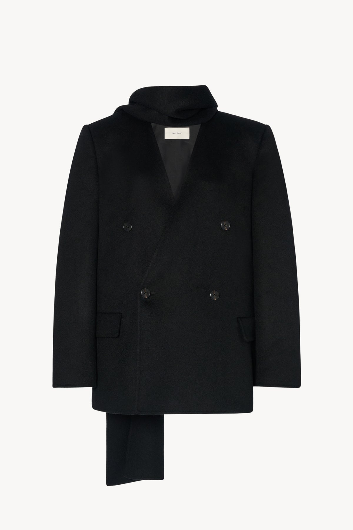 Giacca sartoriale realizzata a mano in cashmere double-face opaco, con sciarpa integrata, tasche frontali con patta e chiusura abbottonata doppiopetto.